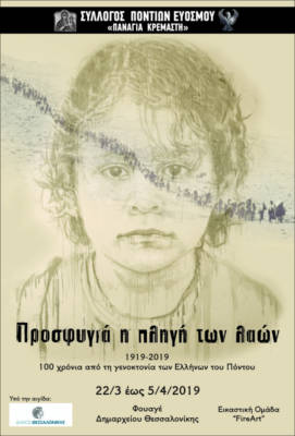 Ο Σύλλογος Ποντίων Ευόσμου «Παναγία Κρεμαστή» υπό την αιγίδα του Δήμου Θεσσαλονίκης διοργανώνει έκθεση πρωτότυπων εικαστικών έργων με θέμα «Προσφυγιά η πληγή των λαών» με αφορμή τα 100 χρόνια από την γενοκτονία των Ελλήνων του Πόντου, στο φουαγιέ του Δημαρχείου Θεσσαλονίκης από τις 22 Μαρτίου έως και τις 5 Απριλίου 2019.