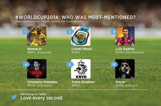 Όσον αφορά στον πιο πολυσυζητημένο ποδοσφαιριστή στο twitter αυτός ήταν ο Βραζιλιάνος Νεϊμάρ και ακολούθησαν οι Λιονέλ Μέσι και Λουίς Σουάρεζ.