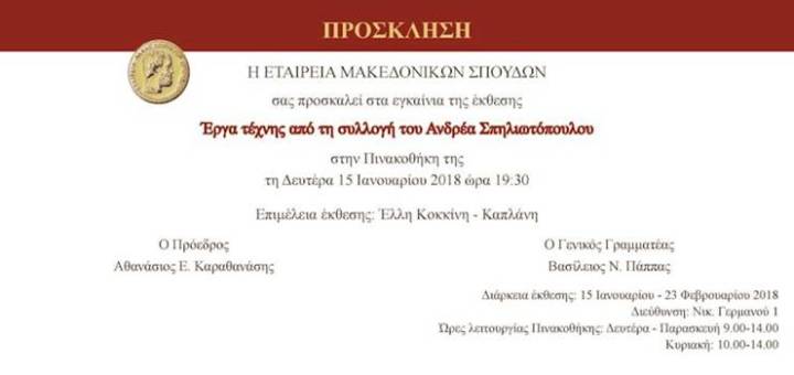 Στις 15 Ιανουαρίου 2018 εγκαινιάζεται στην Πινακοθήκη της Εταιρείας Μακεδονικών Σπουδών έκθεση ζωγραφικής με έργα τέχνης από τη συλλογή του Ανδρέα Σπηλιωτόπουλου. Η έκθεση περιλαμβάνει περί τα 150 έργα, ελαιογραφίες,...