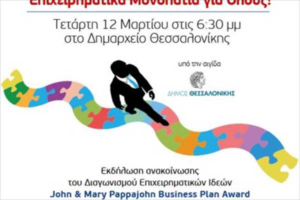 Τη δυνατότητα να κάνουν πράξη τη δική τους επιχειρηματική ιδέα, ακόμη και για όσους δεν έχουν μέχρι σήμερα τολμήσει να “επιχειρήσουν” μόνοι τους, προσφέρει ο Διαγωνισμός Επιχειρηματικών Ιδεών “John & Mary Pappajohn Plan Award”.