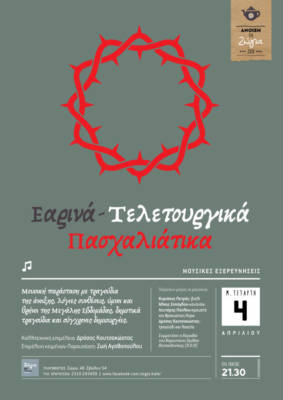 Τελετουργικά τραγούδια της άνοιξης, λόγιες συνθέσεις, ύμνους και θρήνους της Μεγάλης Εβδομάδας, δημώδη άσματα και σύγχρονες δημιουργίες θα έχουν τη δυνατότητα να απολαύσουν όσοι βρεθούν στη Ζώγια, στην οδό Αλ. Σβώλου 54, την Μ. Τετάρτη 4 Απριλίου 2018, στις 21:30, όπου θα παρουσιαστεί η μουσική παράσταση «Εαρινά-Τελετουργικά-Πασχαλιάτικα».