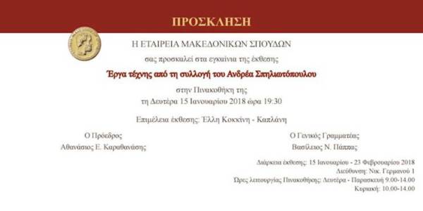 Στις 15 Ιανουαρίου 2018 εγκαινιάζεται στην Πινακοθήκη της Εταιρείας Μακεδονικών Σπουδών έκθεση ζωγραφικής με έργα τέχνης από τη συλλογή του Ανδρέα Σπηλιωτόπουλου.