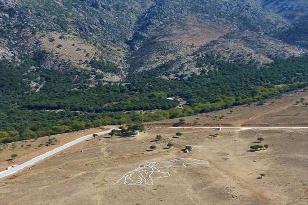 Έτσι λοιπόν με τη συμμετοχή 20 εθελοντών δημιούργησαν το περίγραμμα του αγάλματος σε κάτοψη, 50 m Χ 70 m περίπου, στην πλαγιά που βρίσκεται στη Σαμοθράκη, δίπλα από το Υδραγωγείο της Παλαιόπολης, στο δρόμο προς τη Χώρα.