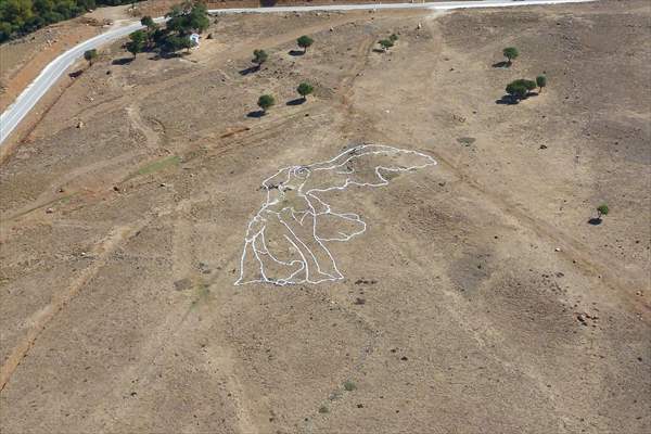 Χρησιμοποιώντας την τεχνική του LAND ART, με πέτρες που μαζεύτηκαν από την γύρω περιοχή δημιουργήθηκε το περίγραμμα του αγάλματος πάνω στη γη και στη συνέχεια αυτό χρωματίστηκε λευκό.