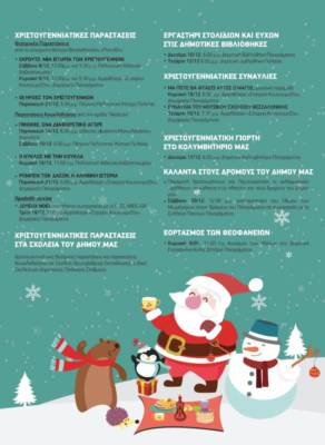 - Τη Δευτέρα 31 Δεκεμβρίου, παραμονή Πρωτοχρονιάς, από τις 11.00 το πρωί οι φιλαρμονικές του δήμου θα ψάλλουν τα κάλαντα στους κεντρικούς δρόμους σε όλες τις δημοτικές ενότητες, ενώ κεφάτοι Άη –Βασίληδες θα μοιράζουν δώρα και χαμόγελα.