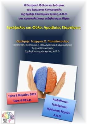 Με αφορμή την έναρξη του νέου μαθήματος, η Επιτροπή Φύλου και Ισότητας του Τμήματος Κτηνιατρικής της Σχολής Επιστημών Υγείας του ΑΠΘ με την υποστήριξη της Κοσμητείας της Σ.Ε.Υ. διοργανώνουν εκδήλωση, όπου θα πραγματοποιηθεί ομιλία από τον Καθηγητή Ανατομικής, Ιστολογίας και Εμβρυολογίας του ΑΠΘ, Γιώργο Χ. Παπαδόπουλο, με τίτλο: «Εγκέφαλος και φύλο: αμοιβαίες εξαρτήσεις».