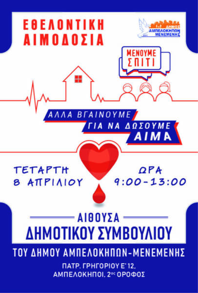 Ο Δήμος Αμπελοκήπων-Μενεμένης ανταποκρινόμενος στο αίτημα των φίλων εθελοντών αιμοδοτών οι οποίοι δεν μπόρεσαν να εξυπηρετηθούν στην εθελοντική αιμοδοσία της 31/3 λόγω της μεγάλης προσέλευσης, διοργανώνει νέα εθελοντική αιμοδοσία την Τετάρτη 8 Απριλίου 2020 από τις 9π.μ. έως τη 1μ.μ. στην αίθουσα Δημοτικού Συμβουλίου, Πατρ. Γρηγορίου Ε’12.