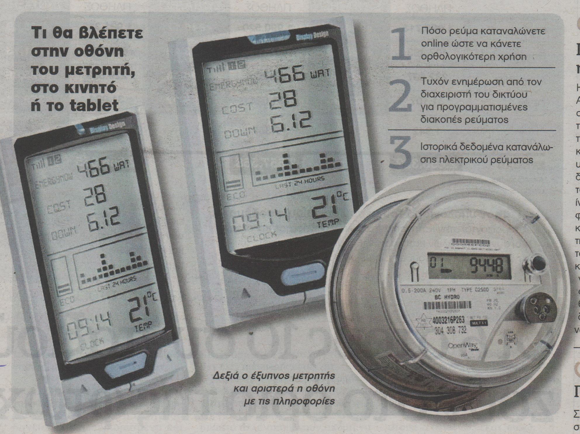 Πρόκειται για μερικές μόνο από τις υπηρεσίες που θα διαθέτουν οι νέοι έξυπνοι μετρητές που πρόκειται να εγκαταστήσει σε μέχρι 200.000 κατοικίες και καταστήματα (170.000 υποχρεωτικά και 30.000 προαιρετικά) ο νικητής του διαγωνισμού που προκήρυξε χθες ο Διαχειριστής του Δικτύου Διανομής Ηλεκτρικού Συστήματος (ΔΕΔΔΗΕ). Επειδή το πρόγραμμα είναι πιλοτικό, σε πρώτη φάση οι οθόνες θα εγκατασταθούν μόνο σε 30.000 κατοικίες.