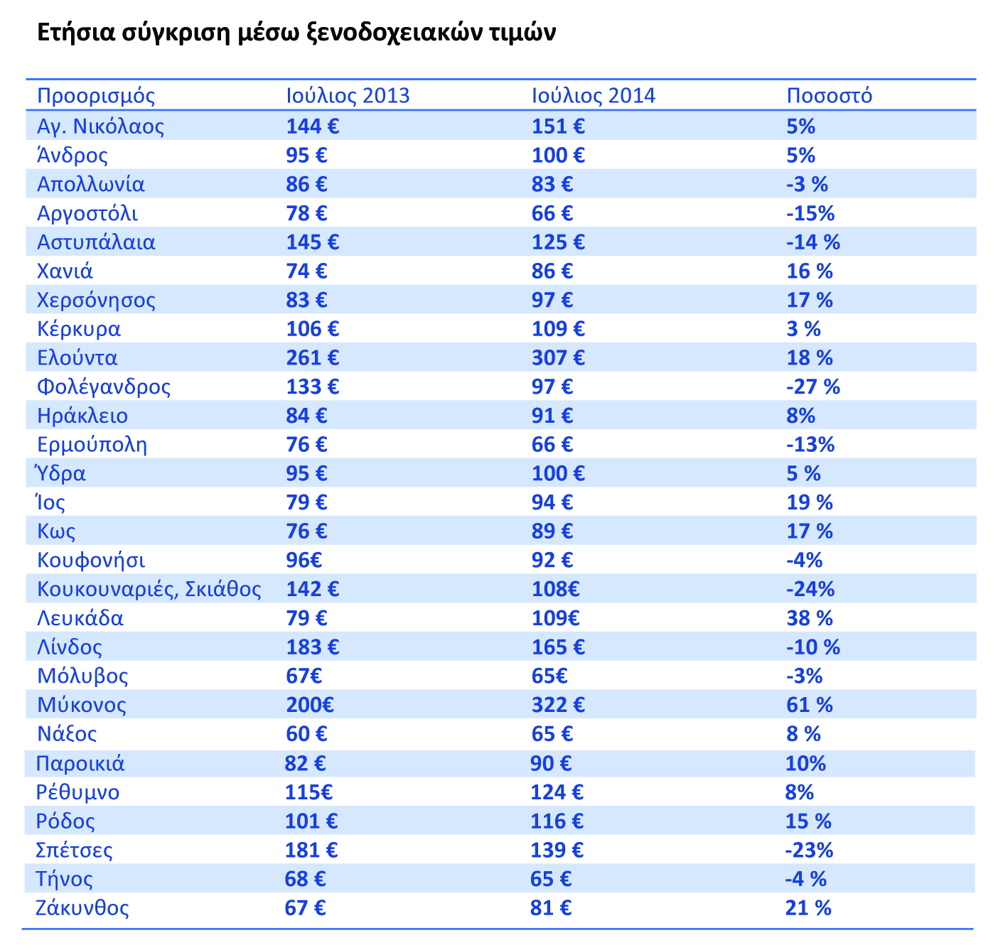 Η μεγαλύτερη μείωση μέσων ξενοδοχειακών τιμών σε σχέση με τον Ιούλιο 2013 παρατηρείται στη Φολέγανδρο, έναν από τους αγαπημένους προορισμούς της νεολαίας, με τη μέση τιμή διανυκτέρευσης να κυμαίνεται ανά διανυκτέρευση στα 97 ευρώ έναντι 133 ευρώ τον προηγούμενο Ιούλιο (ποσοστό μείωσης 27%). Στη δεύτερη θέση των μειώσεων ακολουθεί ένας από τους αγαπημένους οικογενειακούς προορισμούς για διακοπές, οι Κουκουναριές της Σκιάθου. Το ποσοστό μείωσης αγγίζει το 24% και η μέση τιμή διανυκτέρευσης κυμαίνεται στα 108 ευρώ, έναντι 142 ευρώ τον προηγούμενο Ιούλιο. Στην τρίτη θέση ακολουθούν οι Σπέτσες, αγαπημένη επιλογή για μικρές αποδράσεις, με ποσοστό μείωσης μέσων ξενοδοχειακών τιμών στο 23% και τη μέση τιμή δίκλινου δωματίου ανά διανυκτέρευση να κυμαίνεται στα 139 ευρώ, έναντι 181 ευρώ τον περασμένο Ιούλιο.