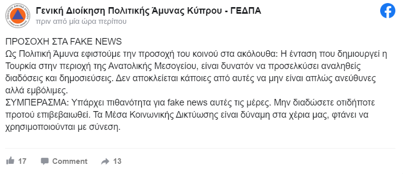 Ανακοίνωση με την οποία προειδοποιεί για ψευδείς ειδήσεις τους Κύπριους πολίτες εν μέσω της έντασης με την Τουρκία, εξέδωσε η Γενική Διοίκηση Πολιτικής Άμυνας Κύπρου.