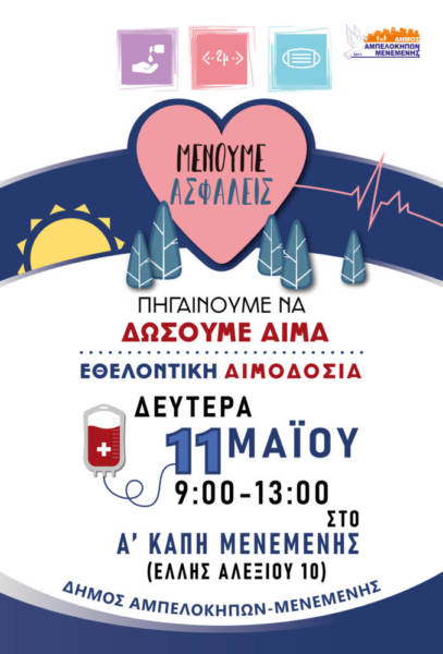 Ο Δήμος Αμπελοκήπων-Μενεμένης ανταποκρινόμενος στην έκκληση αιμοδοτών της Κοινότητας Μενεμένης αλλά και από άλλου, οι οποίοι δεν μπόρεσαν να παραστούν στις δύο δράσεις εθελοντικής αιμοδοσίας στις 31 Μαρτίου και 8 Απριλίου, διοργανώνει την Δευτέρα 11 Μαΐου από τις 9π.μ. έως 1 μ.μ. εθελοντική αιμοδοσία στο ΚΑΠΗ Μενεμένης (Έλλης Αλεξίου 10).