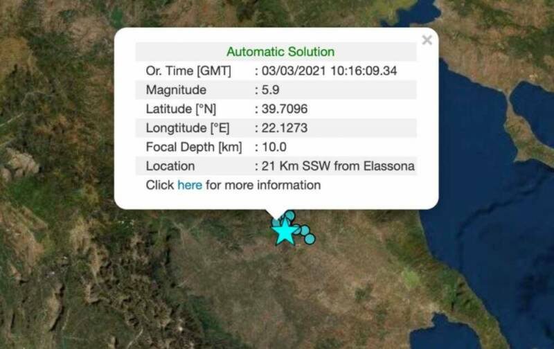 Ο σεισμός σημειώθηκε μεταξύ Ελασσόνας και Λάρισας και συγκεκριμένα 21 χιλιόμετρα νότια νοτιοδυτικά της πρώτης.