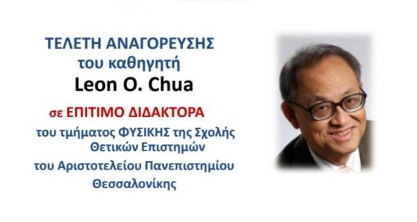 Σε Επίτιμο Διδάκτορα του Τμήματος Φυσικής της Σχολής Θετικών Επιστημών του ΑΠΘ θα αναγορευτεί ο Καθηγητής Leon O. Chua. Η Τελετή Αναγόρευσης θα πραγματοποιηθεί τη Δευτέρα 22 Οκτωβρίου 2018 και ώρα 19:00, στην Αίθουσα Τελετών «Αλέξανδρος Παπαναστασίου» της Παλαιάς Φιλοσοφικής Σχολής του ΑΠΘ.