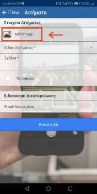 Βήμα 1: Επιλέγετε να ανεβάσετε φωτογραφία από το αίτημά σας. Η φωτογραφία αυτή μπορεί να είναι είτε από προηγούμενη χρονικά λήψη, είτε να τη βγάλετε τη στιγμή της αποστολής του αιτήματος. Σε περίπτωση που είναι στο αρχείο του κινητού σας, τότε κρατάει στη μνήμη την τοποθεσία λήψης.