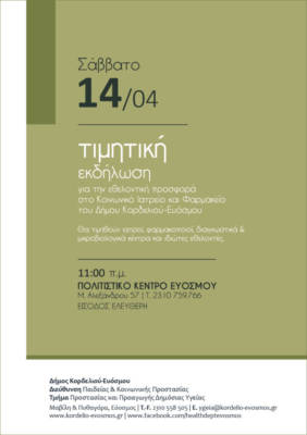 Η τελετή επιβράβευσης των ιατρών και φαρμακοποιών, των διαγνωστικών και μικροβιολογικών κέντρων και των εθελοντών του Κοινωνικού Ιατρείου και Φαρμακείου, που διοργανώνει το Τμήμα Προστασίας και Προαγωγής Δημόσιας Υγείας της Διεύθυνσης Κοινωνικής Προστασίας και Παιδείας, θα πραγματοποιηθεί το Σάββατο 14 Απριλίου και ώρα 11.00πμ στο Πολιτιστικό Κέντρο Ευόσμου (Μ. Αλεξάνδρου 57), σε μια ανοιχτή εκδήλωση που αναδεικνύει την κοινωνική ευαισθησία και αλληλεγγύη της τοπικής κοινωνίας του δήμου απέναντι σε εκατοντάδες συνανθρώπους μας που αντιμετωπίζουν προβλήματα επιβίωσης και κοινωνικού αποκλεισμού.