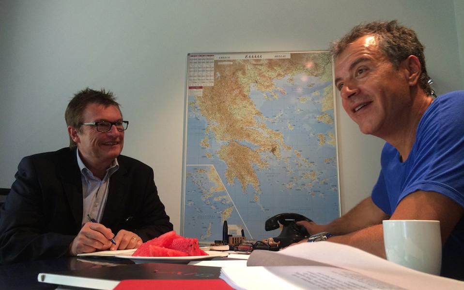 Σε ερώτηση εάν συμμερίζεται την άποψη πολλών Ελλήνων που θέλουν την έξοδο της χώρας από την ευρωζώνη προκειμένου να απαλλαγούν από την πολιτική των περικοπών, ο κ. Θεοδωράκης απαντά ότι δεν μπορεί να φανταστεί να απομακρύνεται η Ελλάδα από την ΕΕ. «Αυτό όμως δεν σημαίνει ότι θα πρέπει να πληρώνουμε κάθε τίμημα έναντι των Βρυξελλών. Δεν απειλούμε, αλλά δεν είμαστε και δουλοπρεπείς». Στην ερώτηση δε εάν θα ήθελε να αναλάβει κάποιο πόστο στην επόμενη κυβέρνηση, ο πρόεδρος του Ποταμιού απαντά ότι δεν τον ενδιαφέρει να είναι υπουργός. «Επί χρόνια παρουσίαζα την πιο πετυχημένη τηλεοπτική εκπομπή της χώρας. Πάντα ήθελα να κάνω κάτι για την Ελλάδα, αλλά ποτέ να γίνω υπουργός».