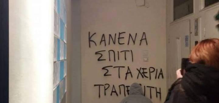 Συνθήματα σε τοίχους πολυκατοικίας όπου στεγάζεται το γραφείο της προέδρου των συμβολαιογράφων Θεσσαλονίκης Ιωάννας Μπιλίση – Χρουσαλά έγραψαν άγνωστοι το απόγευμα της Τρίτης, σε ένδειξη διαμαρτυρίας για τους πλειστηριασρμούς. Περίπου...